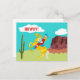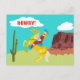 Say hello with a western accent. This postcard features a retro style illustration of a cowgirl on horseback in a western landscape with the message HOWDY! written in the clouds. The back of this postcard is blank for your to write in your own message and the recipient's address.