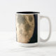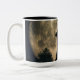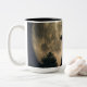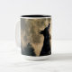 Somewhere in the wilderness of North America, a grey wolf howls in front of a full moon.