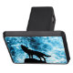 Abstract geometric winter snowy blue and white smoke with black wolf silhouette.