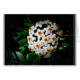 A beautiful big white hoya flower with red tips, some of which have water drops. It glows in the warm sun against a background of dark green waxy leaves and black shadows. An elegant card both because of the colour, lighting and overall feel of the photograph as well as due to the rarity of these unique flowers.