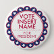 Whether you're campaigning to lead the country, your town, your school, your work, or independently supporting your favorite candidate, this custom pinback button will get noticed. Easily personalize this button with your own name and title or other custom text. This design features red, white, and blue colors with a circle of white stars. (Tip: For a two word candidate title such as "Vice President", you can change the word "For" to "Vice".) No minimum order quantity and no setup fee.
