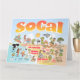 Bright and colourful scene offers a spectacular view of Southern California - wacky characters frolic on the beach and desert of SoCal showcasing Los Angeles, San Diego, Orange County, Santa Barbara, Riverside, Palm Springs, Anza Borrego and Joshua Tree parks as well as the border cities of Tijuana, Tecate and Mexicali. This charming scene has it all – a surfer hangs ten while a killer whale leaps out of the water, zoo animals greet the tourists, a muscular beach couple both flex to impress as a T-Rex roars a challenge and a tank moves into position and much more…