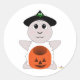 This cute anime-ish white sheep loves to dress up and is wearing a witch costume. The witch costume has a black witches hat with a frog sitting on top. This white sheep is also has a hollow jack-o-lantern pumpkin sitting in front to hold Halloween candy.