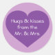 This custom round sticker features a shapely purple heart overlaid by the template text, "Hugs & kisses from the Mr. & Mrs." at its centre.