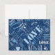 this postcard has a text design with hearts, hugs, kisses and love that is perfect for gifting at any time of the year. Available in several colour palettes, this example has beautiful typography in shades of blue and white on your choice of background colour. Search ID286 to see other colour options and matching products with this design.