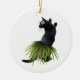 A black cat wearing a green grass hula skirt and with a pink flower behind her ear. This cute dancing cat is makes a perfect Hawaiian ornament. Customize by adding your own words.
