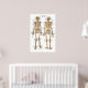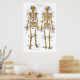 Human anatomy skeleton poster. Anterior and posterior views of the bones of the body with ligaments and tendon attachments of the joints. Bones and sutures of the skull. Bones and ligaments of the hand, foot, shoulder and pelvis.