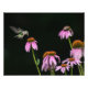 A sweet little hummingbird joins a bee at some purple coneflower blossoms. The shady background makes the image pop.