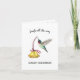 Hand-painted Christmas card featuring a ruby-throated hummingbird carrying Christmas bells.