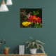 This poster features a female ruby-throated hummingbird. She hovers in the air while drinking nectar from the golden centre of a bright red zinnia flower. A yellow zinnia blossom is nearby. The colours seem brilliant against the background of green leaves and dark shadows.