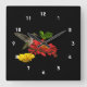 This colourful, whimsical wall clock features a ruby-throated hummingbird visiting red and yellow zinnias. The bird and flowers are set off by a pure black background. This would be the perfect gift for a gardener!