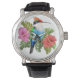 Beautiful and Colourful Hummingbird resting on a Branch, surrounded by Hibiscuses and Leaves, Watercolor Style Vector Illustration Copyright BluedarkArt.