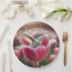 A hummingbird is bathing inside a pink tulip creating water to splash