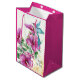 You and your gift recipient will love this medium sized gift gift bag that features a watercolor of a hummingbird and hibiscus flower. A bold pink sets off this design on the sides and edging of the bag.