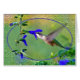 This female ruby throated hummingbird is feeding at a bright blue flower. The image is framed with a stained glass design.