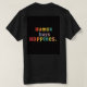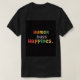 The t-shirt design features the phrase "Humour Buys Happiness" in bold, multi-coloured lettering. The colours are vibrant and eye-catching, creating a fun and energetic atmosphere. The design is minimalist, focusing solely on the text and the bold colour palette. The overall effect is cheerful and uplifting, conveying a positive message about the power of humour.