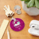 A keychain with a humourous design. A sleeping uncorn with a fancy mane and tail. Deocrated with a trio of stars stars. A rainbow arches overhead. A circle made up of clouds, hearts and flowers for additional girly flair. Typography says Magical AF. Humourous and cute. The background is a dark reddish pink striped pattern. Creative and cool.