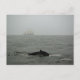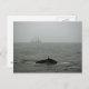 A photograph of a Humpback Whale making a dive, and a tall ship in the background.