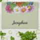 Destei's original cartoon illustration of a cute Hungarian Vizsla breed dog's head close-up surrounded by colourful summer wildflowers. There is a blush pink flower, a purple flower, a dark pink flower and a white daisy flower together with some green leaves and branches. The background colour is green with a light polka dot pattern. The background colour can be changed to any other colour and the polka dot pattern can be removed, if so wished. There is also a personalizable text area for a name or other custom text.