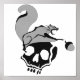 A grey flying squirrel climbing over a tilted black skull. This ugly looking rodent has its claws reached out towards an acorn. The mouth is mostly filled with sharp teeth.