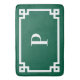 Decorative white Greek Key style geometric rectangular border on a hunter green 24" x 36" bath mat with a modern serif monogram.