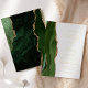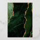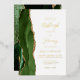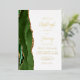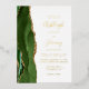 The left-hand edge of this elegant modern wedding invitation features a hunter green watercolor agate border trimmed with faux gold glitter. The customizable text combines handwriting, copperplate and italic fonts in real gold foil on a white background. The reverse side features a matching green and gold agate design.