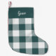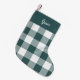 Festive spruce green and white stocking features a buffalo plaid check pattern with your name or monogram at the top in white calligraphy script lettering.
