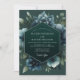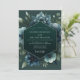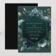This elegant design features a dramatic floral display. Painterly slate blue and ivory anemones bloom from a deep, hunter green background. Lush foliage and delicate buds complete the moody and romantic composition, perfect for a sophisticated evening affair.