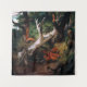 The two men are hunting a duck in a lush and colourful landscape of tall trees and high grasses as they pass underneath fallen tree that is bare of its bark and shines white in the daylight.