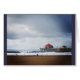 A stormy winter morning in Huntington Beach, Southern California. View of the Ruby's Diner on the end of the pier, the shadow of Catalina Island in the distance, & large waves that make this a popular surfing spot.