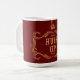 Funny coffee mug for country folks features gold "hush up" text and fancy frame on dark red background. A perfect way to remind others to stop talking while you're drinking!