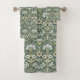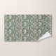 Hyacinth Flowers in the style of William Morris, muted green and blue tones with white flowers, symmetrical design, repeating patterns, patterned background, floral motifs of green leaves.