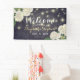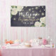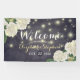Wedding Welcome Banner Templates - Elegant White Hydrangea Flowers and String Lights on Vintage Navy Blue Floral Linen Background.