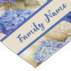 Customize this elegant table runner with a pattern of blue and purple hydrangeas with your family name.