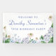A beautiful welcome sign with the Wow factor that will impress your guests. Soft dusty blue and purple hydrangeas mix with soft blush white and blush white wild roses. The birthday celebrant's name is written in an easy-to-read script font. the Birthday year follows in a bold traditional serif font. All of the text is editable so you can customize your welcome.