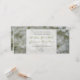 A skinny wedding invitation featuring a background of white hydrangeas on front and back. Personalize the green and grey text at centre with details of your occasion. Wording is from bride's parents. Look for matching items at Jill's Paperie.
