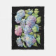 If you love hydrangeas, you'll certainly enjoy the lovely floral art on this blanket.  Blooming hydrangeas are shown in delightful shades from pink to blue to lavender.  Background is black but may be changed by customizing.