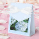 Wedding favour box shown in blue with a photo print of pretty hydrangeas and with a white ribbon bow. Customize this item or buy as is.