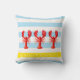 Decorate your summer home or beach house with a classic nautical pillow. Light blue pastel, yellow and white coloured horizontal stripes. With three red lobsters as decor. A single yellow stripe and the text: Summer & Hygge