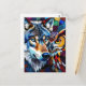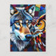 Keep in touch with this colourful vibrant postcard. A vibrant colourful ai illustration of a wolf and an owl in a mosaic stained glass effect.