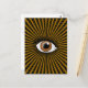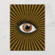 illustration of brown eye with dark golden sun rays beaming straight out and in swirl pattern against a black background. Talisman for self-hypnosis.