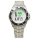 Has heft and feel of expensive stainless steel quartz watches. Good band with safety catch.  I removed links, which is easy because engraved arrows show direction to push the linking pins. As always by this seller, the image (a railroad logo) is a perfect reproduction of my emailed image, and is precisely spaced and aligned.