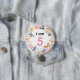 A pretty pin badge with "I am 5" words surrounded by a border of flowers and butterflies. The cute button is white with a pink number five and pastel coloured floral edge. An adorable accessory for a birthday.