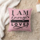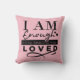 Pillow reads: I Am (strong, beautiful, kind) Loved, on one side (custom background colour).