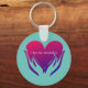 This keychain features a large pink heart held in 2 hands on a serene aqua blue background.