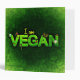 I am vegan written in bright green on a dark green canvas like background. The word vegan is written with a green grassy looking texture. Little nature themed ladybugs, daisies and leaves decorate the words.