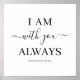 This modern design features the bible verse "I am with you always." Matthew 28:20 in elegant black serif and script font, on a white background. Text is customizable.