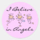 Trois adorables bâtons anges avec halos et texte qui dit "Je crois en les anges" sur des autocollants avec un arrière - plan rose, parfait pour quiconque aime et croit en les anges!