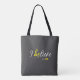 Embrace self-confidence with this stylish and empowering grey tote bag. The modern design features the phrase "I believe in me," with a clever pop of colour that draws the eye to the message. The word "be" and the entire word "me" are highlighted in a bright, optimistic yellow, while the rest of the text is in sleek, contrasting white. Paired with classic black handles, this tote makes a powerful statement without being overly flashy.