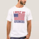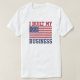 "I Built My Business" t-shirt design featuring the American flag and text in the colours "Old Glory Red" and "Old Glory Blue" - the official colours used in the USA flag. All text elements are customizable on-page.